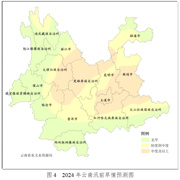 汛前尤其是4月至5月全省大部旱情偏重。據(jù)水文部門(mén)預(yù)測(cè),預(yù)計(jì)1月至5月全省主要江河來(lái)水整體偏少,全省部分中小河流可能斷流,汛前昆明市主城區(qū)、玉溪市紅塔區(qū)、楚雄州楚雄市、臨滄市臨翔區(qū)存在較大供水壓力。滇中大部、滇東北大部、滇東大部、滇西北東部和北部、滇西東部、滇南北部發(fā)生輕度至中度干旱的可能性較大,其中曲靖市中南部、文山州北部、紅河州北部、玉溪市東部、昆明市東南部和北部、昭通市西南部、楚雄州大部、普洱市北部、臨滄市東北部、大理州東南部、麗江市南部以及金沙江、紅河、瀾滄江干熱河谷地區(qū)可能發(fā)生中度及以上干旱(見(jiàn)圖4),抗旱形勢(shì)嚴(yán)峻。建議:密切監(jiān)測(cè)旱情動(dòng)態(tài),提前謀劃做好抗旱減災(zāi)準(zhǔn)備,提高抗旱保供能力,確保生活生產(chǎn)生態(tài)用水安全。