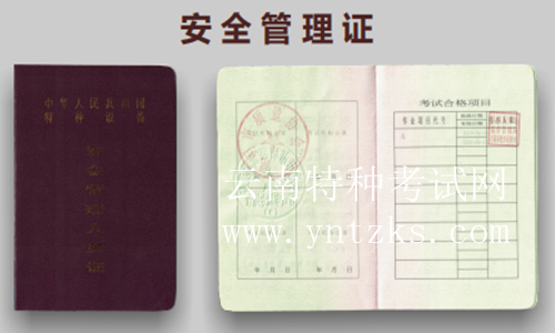 鍋爐、壓力容器、電梯、起重機(jī)械、客運(yùn)索道、場(chǎng)(廠)內(nèi)專用機(jī)動(dòng)車輛的管理人員統(tǒng) 稱為特種設(shè)備安全管理人員,代號(hào):A。證書(shū)全國(guó)通用,國(guó)網(wǎng)查詢。4年一復(fù)審,由昆明 市市場(chǎng)監(jiān)督管理局頒發(fā)。